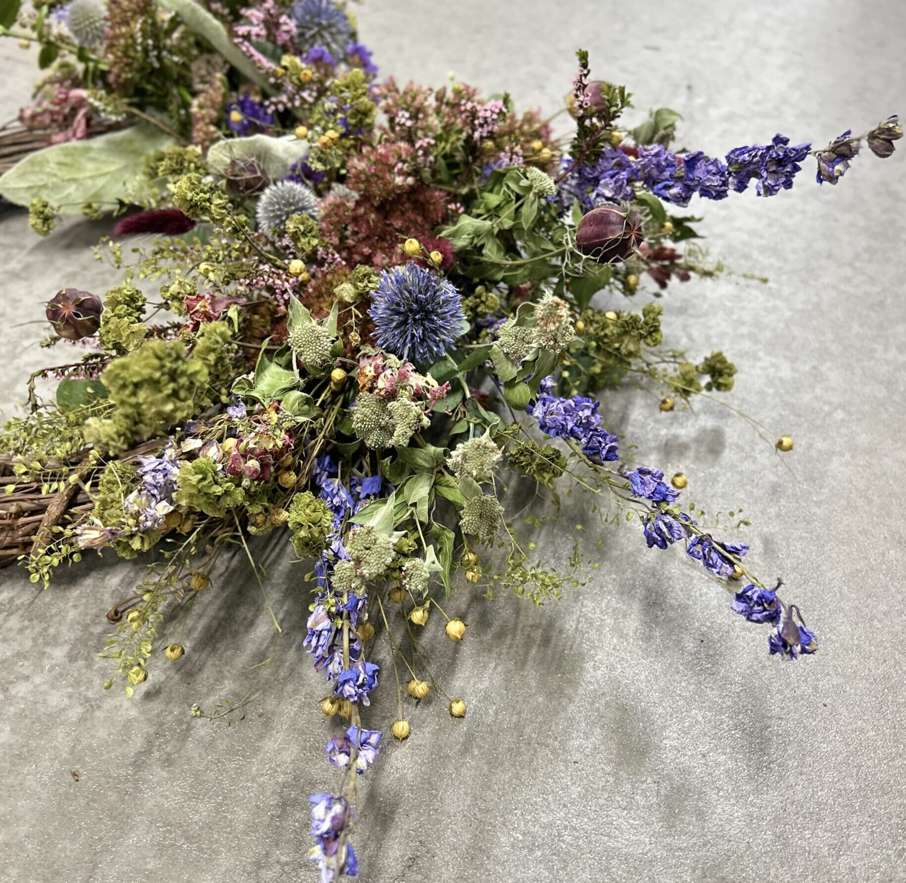 We cultivate and harvest 90% of the flowers used in our wreaths. When we do source flowers, they are sourced from like-minded local flower farms, and we take care of drying them ourselves. We are intentional about growing our flowers in sustainable urban gardens.